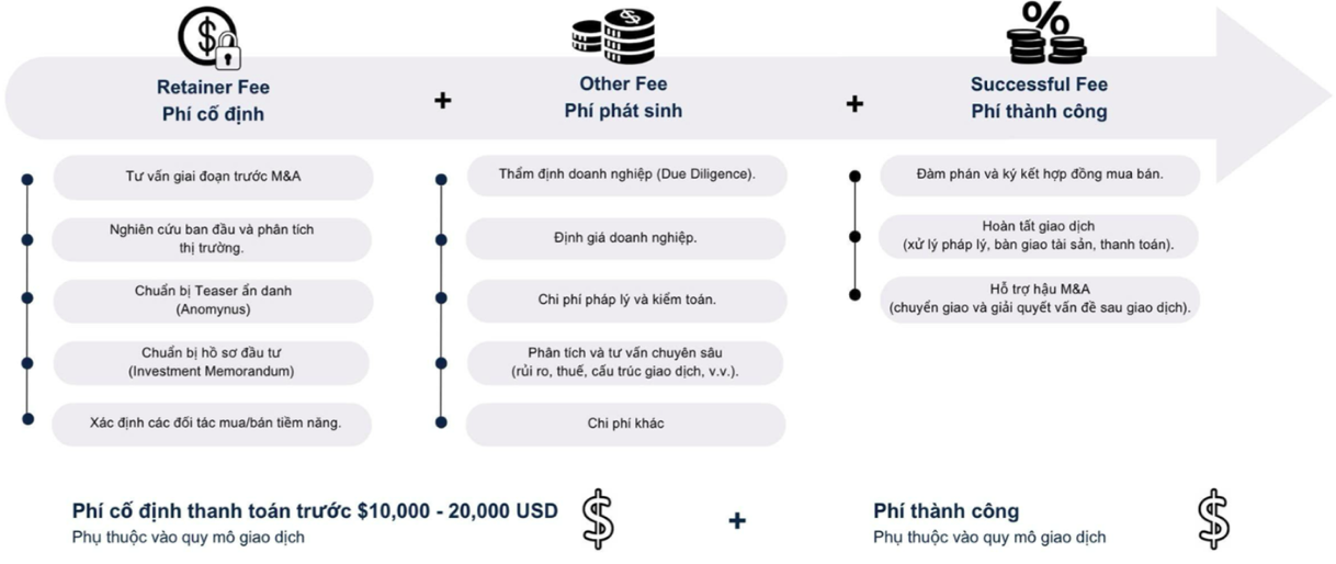 Chúng tôi hiểu rằng thị trường hiện nay đang áp dụng mức phí cao đối với các giao dịch M&A, gây áp lực tài chính không nhỏ cho người bán. Để cạnh tranh và mang lại lợi ích tối đa cho khách hàng, chúng tôi cam kết tài trợ toàn bộ chi phí liên quan đến quá trình giao dịch cho đến khi thương vụ được hoàn tất thành công. Điều này có nghĩa là Doanh nghiệp sẽ không phải chịu bất kỳ khoản phí nào cho đến khi đạt được kết quả mong muốn. Trong khi nhiều đơn vị khác yêu cầu phí trả trước cao và phí dịch vụ ngay cả khi chưa đạt được kết quả, chúng tôi đặt lợi ích của Doanh nghiệp lên hàng đầu, đảm bảo rằng Doanh nghiệp chỉ phải thanh toán khi thương vụ thực sự mang lại giá trị.